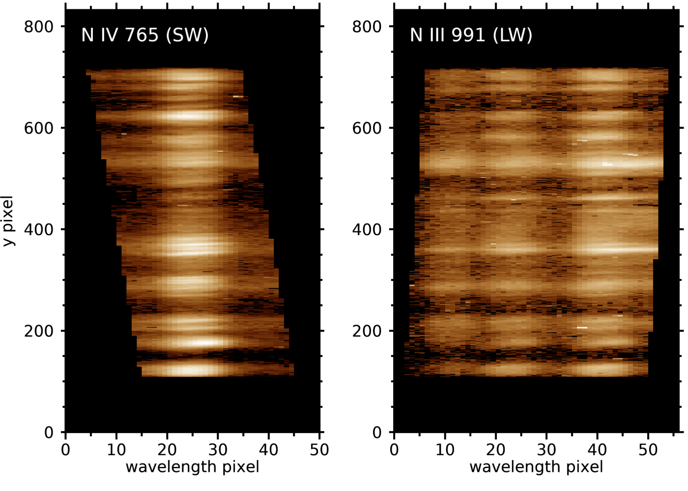 A further problem is when a window contains more than one line, which makes it more difficult to estimate a continuum level. For example, N IV 765.15 has a weak blend on the short-wavelength side (N III 764.35). At the top of the slit there may not be enough continuum for a good fit, while at the bottom of the slit there may not be enough pixels to accurately fit the blending line.